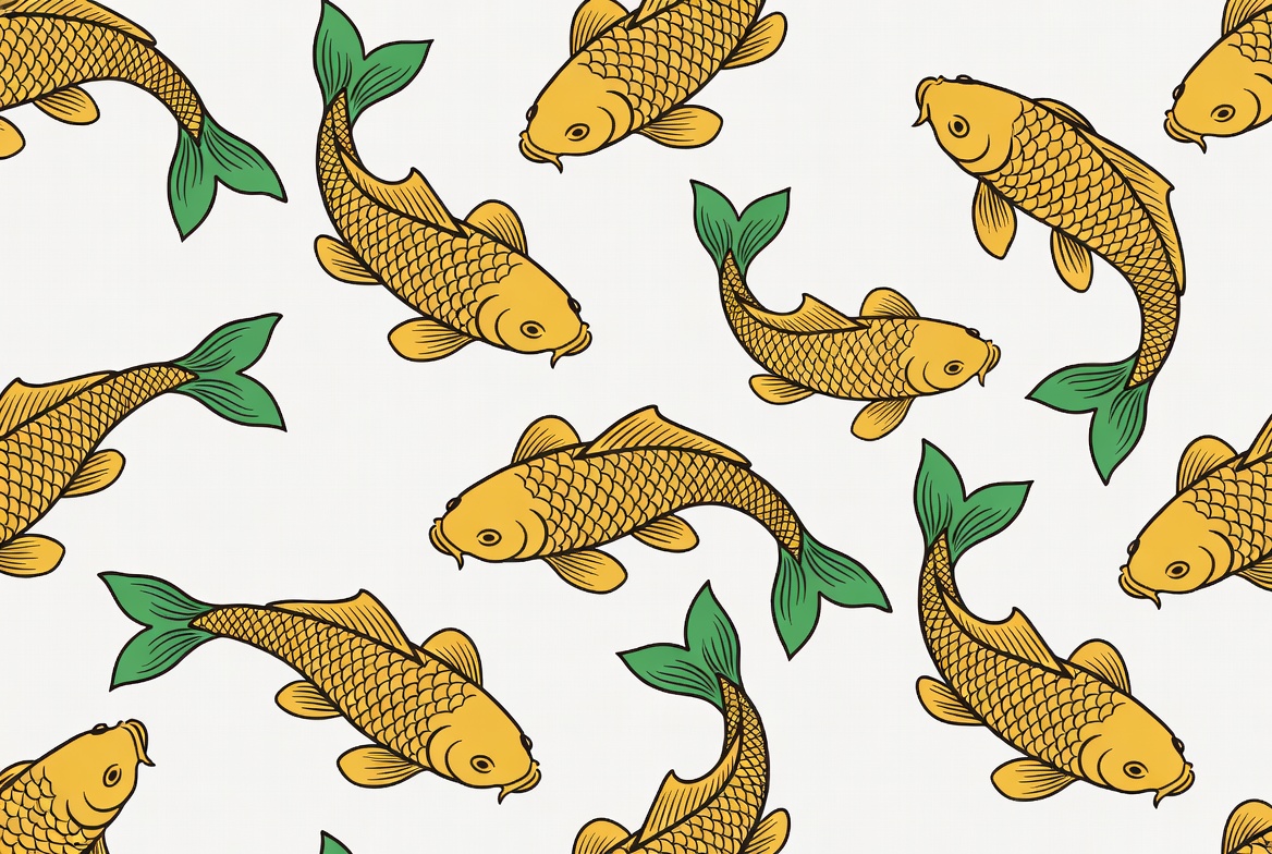 A seamless pattern features multiple yellow koi fish with green fins on a white background. The fish are illustrated in a cartoon style, swimming in various directions. The design repeats continuously for use as wallpaper or fabric.