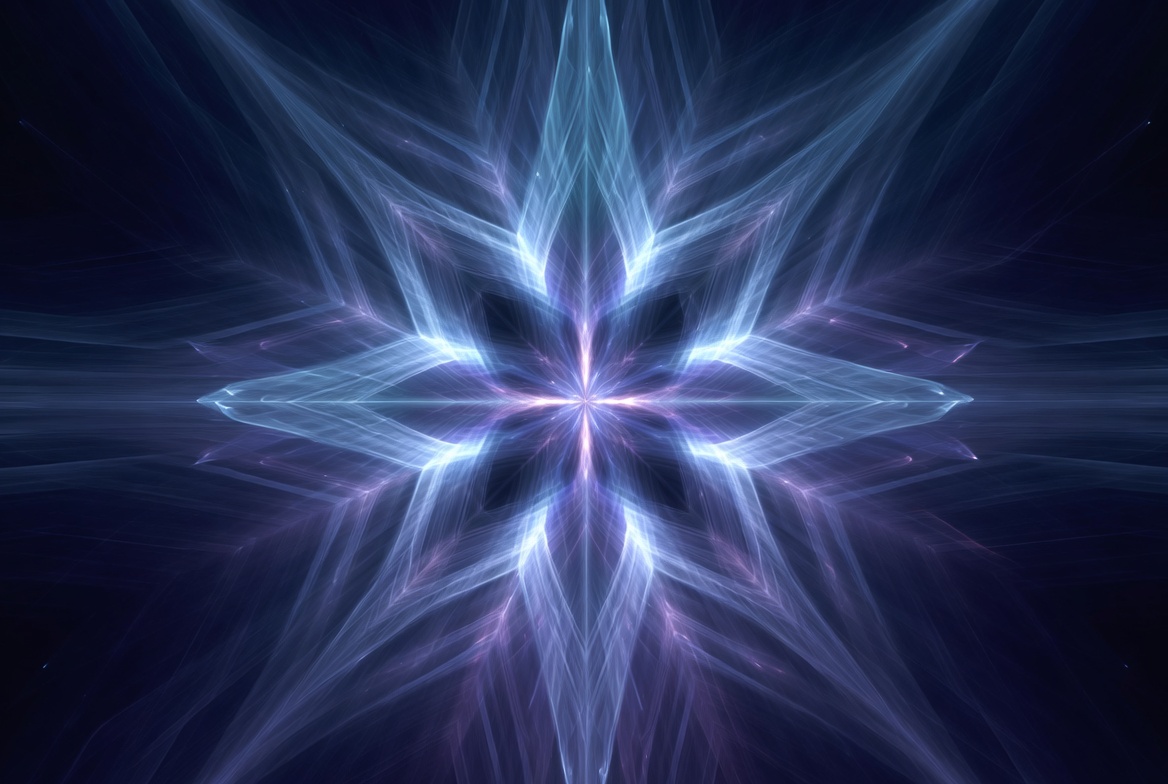 A radiant blue starburst fractal design glows against a dark background. Intricate neon-like rays extend symmetrically from the bright central core. The electric blue and purple hues create a mesmerizing energy pattern.