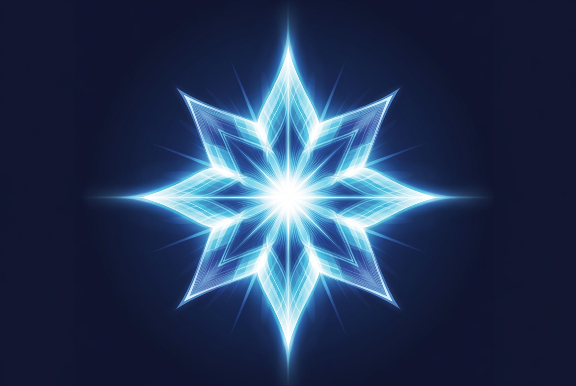 A radiant blue snowflake with intricate pointed arms glows brightly against a dark background. The design features sharp, symmetrical edges and a luminous white center. It appears as a digital illustration or clipart.