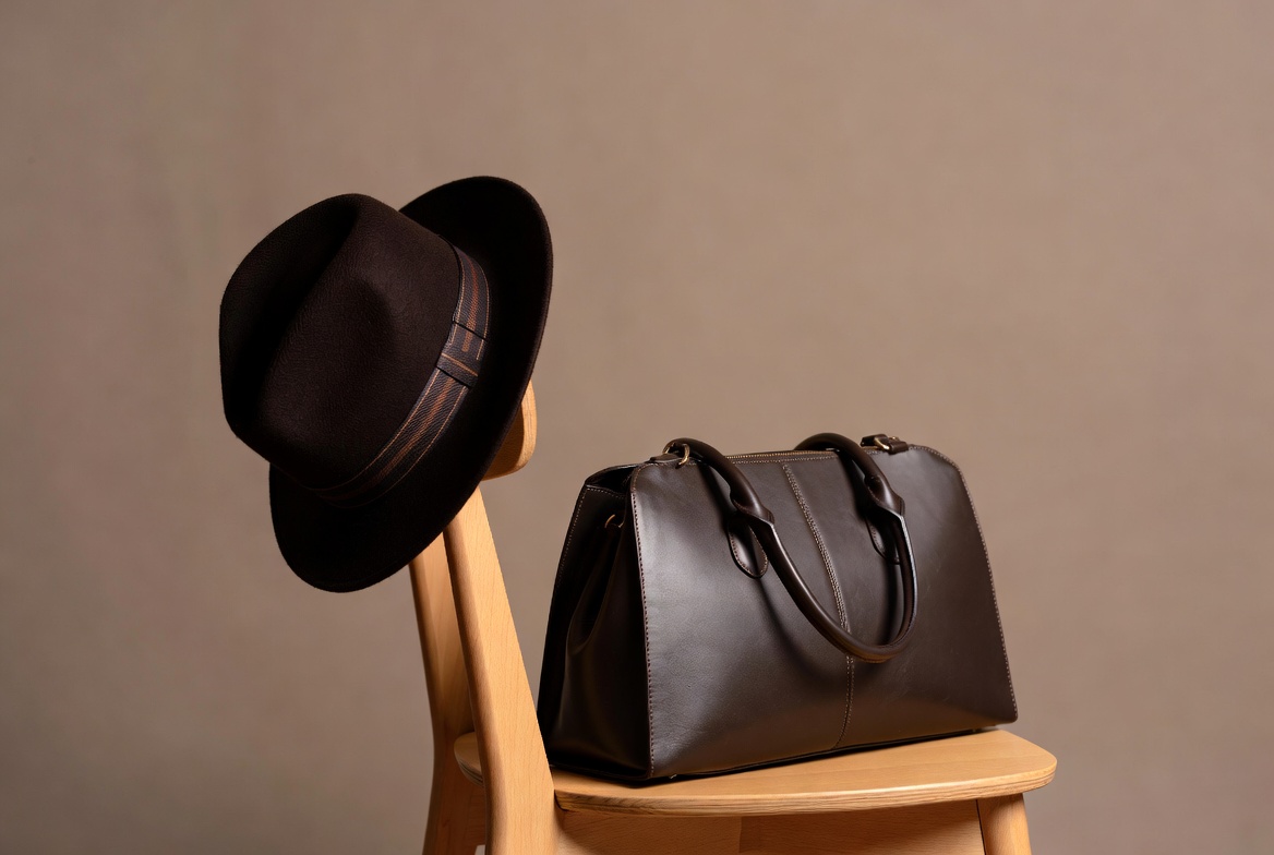 black hat, brown purse, fashion accessories, hat and bag, isolated background, leather handbag, luxury purse, mannequin head, neutral background, stylish hat, top handle bag, wooden chair, fedora hat