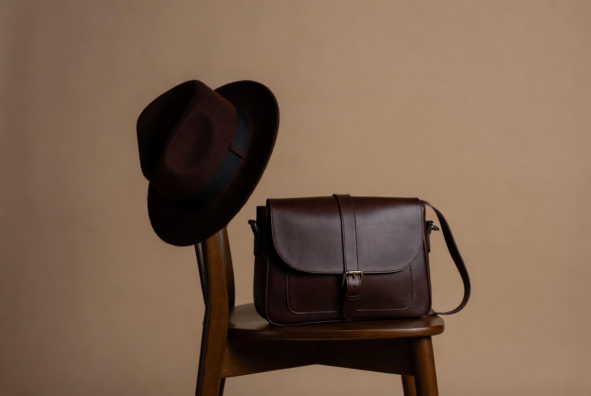 A brown fedora hat with a black band sits atop a wooden chair. Next to it rests a brown leather crossbody bag with straps and buckles. The items are displayed against a beige background.