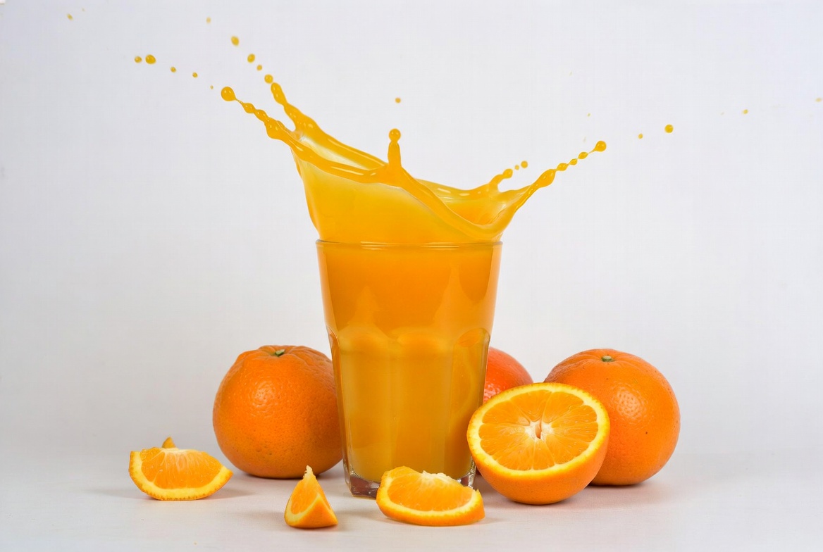 beverage, citrus, clear glass, drink, fresh juice, fruit, isolated background, juice glass, orange slices, orange splash, oranges, ripe oranges, splash effect, white background, orange juice