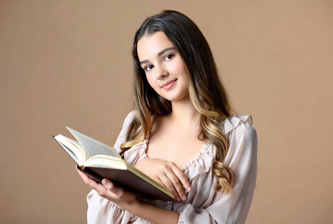 White, beige background, brown hair, female, girl, holding book, off-shoulder top, open book, pink blouse, portrait, reading book, ruffled blouse, smiling, studio photo, wavy hair, young woman, teen girl