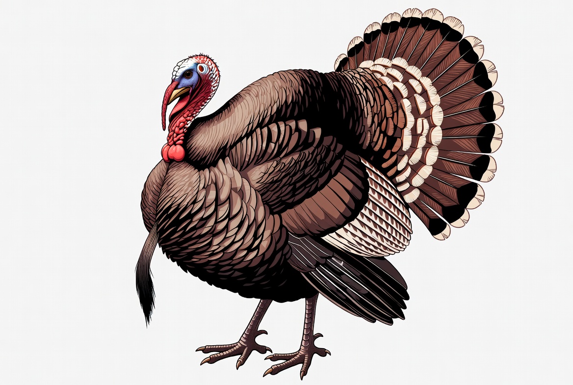 animal illustration, bird, blue face, brown turkey, clipart, farm animal, feathers, illustration, isolated background, red head, standing, tail feathers, thanksgiving turkey, vector art, wattle, wild turkey, turkey