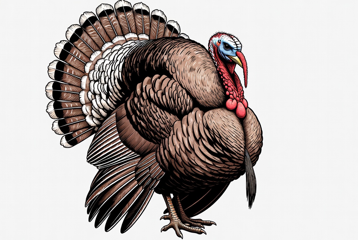 A detailed illustration of a male turkey stands with its tail feathers fully spread in a fan shape. The turkey has brown feathers, a red wattle, blue head, and yellow beak. It is depicted on a white isolated background.