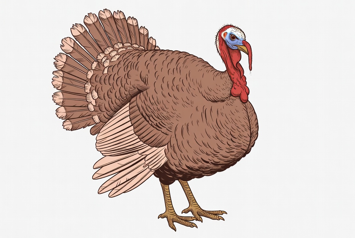 A detailed cartoon illustration of a large brown turkey with fanned tail feathers stands on a plain white background. The turkey features a red wattle, blue head with white accents, and yellow legs. It faces slightly to the side with wings partially spread.