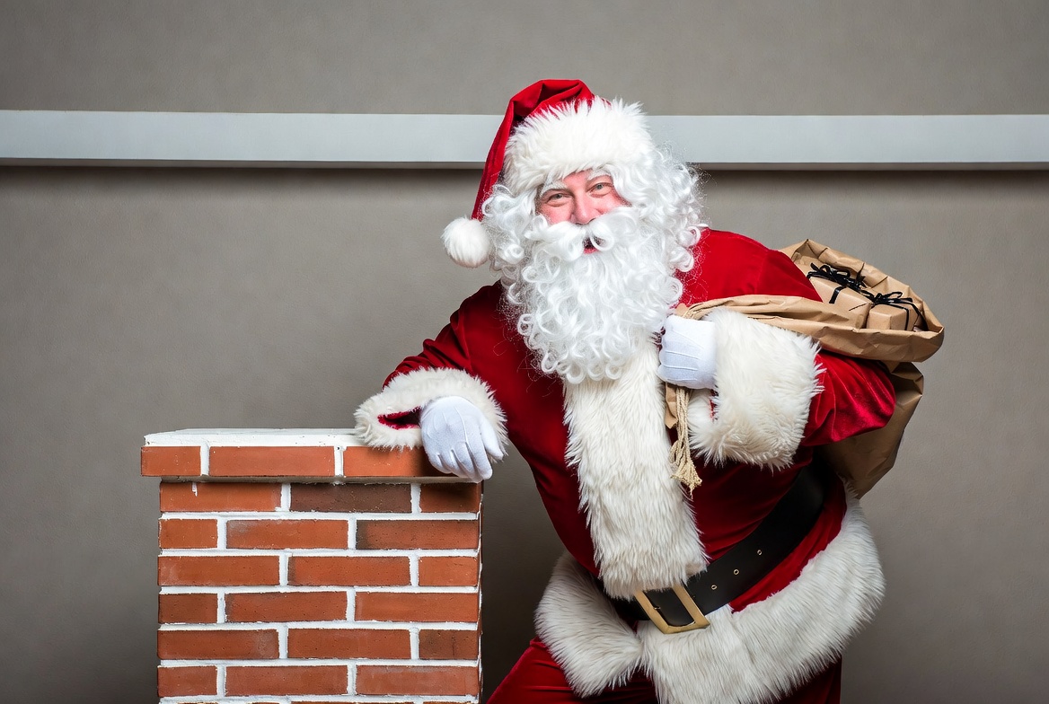 A man dressed as Santa Claus in a red suit, white-trimmed hat, and long white beard stands smiling next to a brick chimney. He holds a brown sack over his shoulder with white-gloved hands. The background is a plain gray wall.