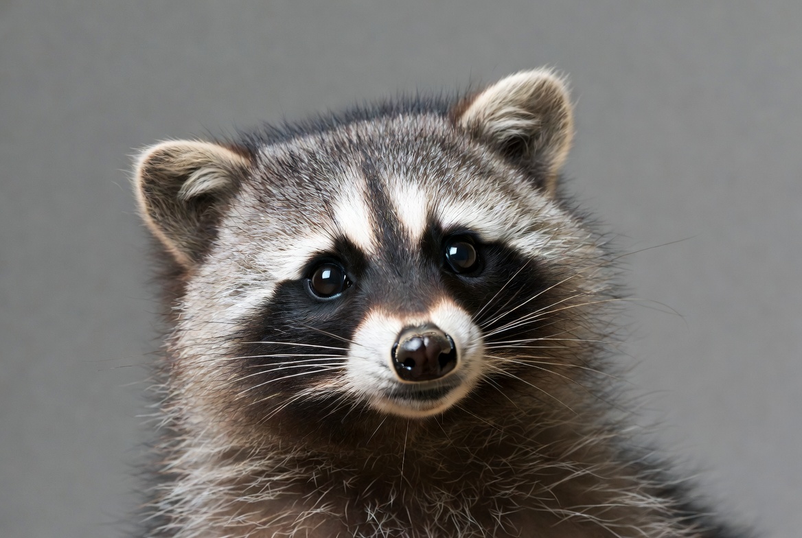 A raccoon with a black mask around its eyes stares directly at the camera on a plain gray background. Its fluffy gray fur and pointed ears are prominently featured in the close-up portrait. The animal's whiskers and small pink nose add detail to its expressive face.