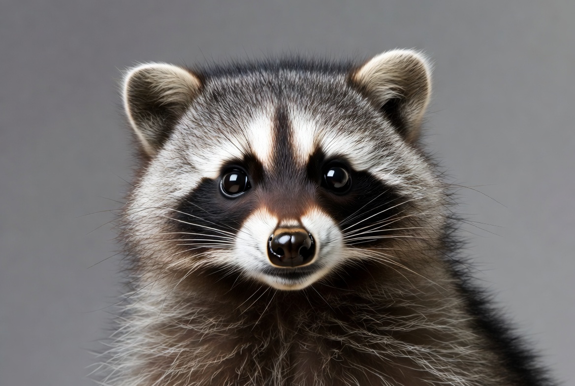 animal eyes, big eyes, black mask, close-up, cute raccoon, fluffy fur, forest animal, gray fur, isolated background, mammal, masked face, pink nose, pointed ears, portrait, raccoon face, wild animal, wildlife, raccoon