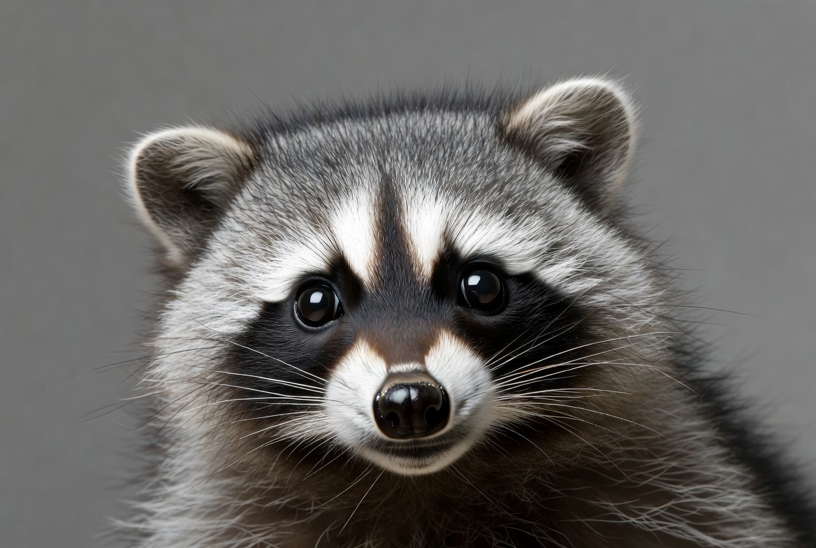 A raccoon with distinctive black mask around its eyes stares directly at the camera. Its fluffy gray fur and large expressive eyes are highlighted against a plain gray background. The animal's small nose and whiskers are clearly visible in this detailed portrait.