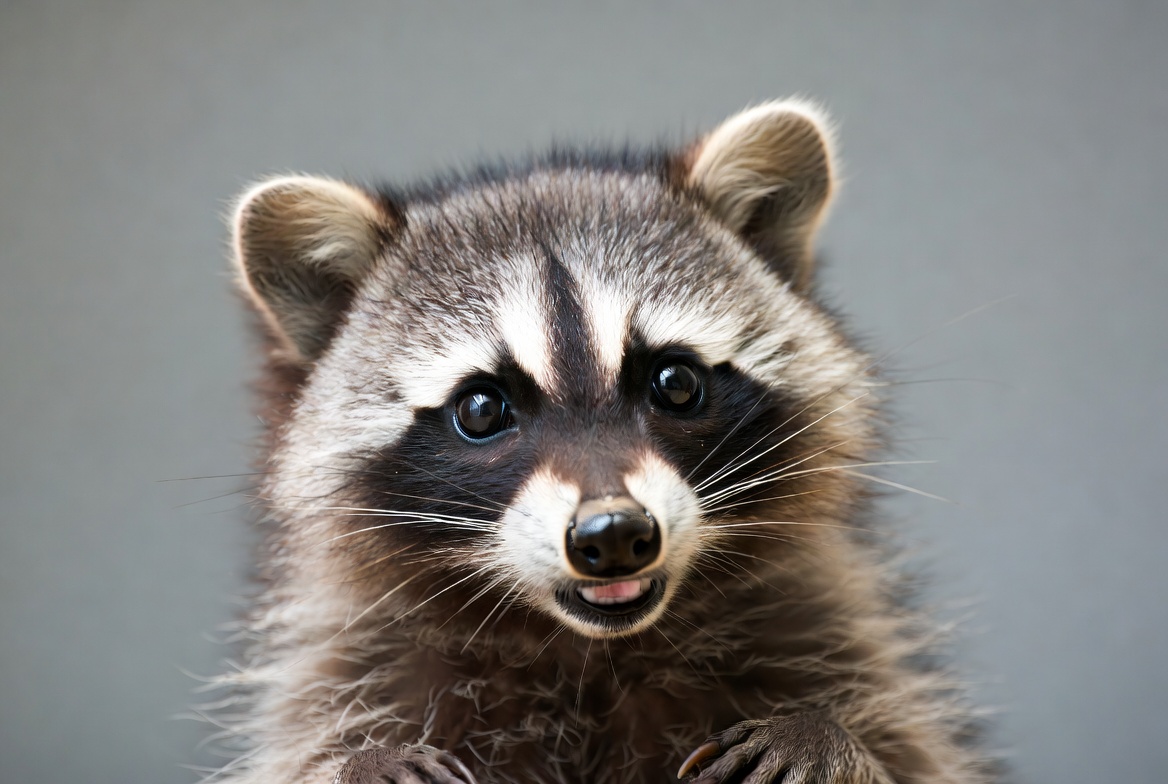 adorable, animal, black mask, blue eyes, cute raccoon, fluffy fur, forest animal, gray background, isolated background, mammal, masked face, paws up, pink tongue, portrait, wildlife, raccoon