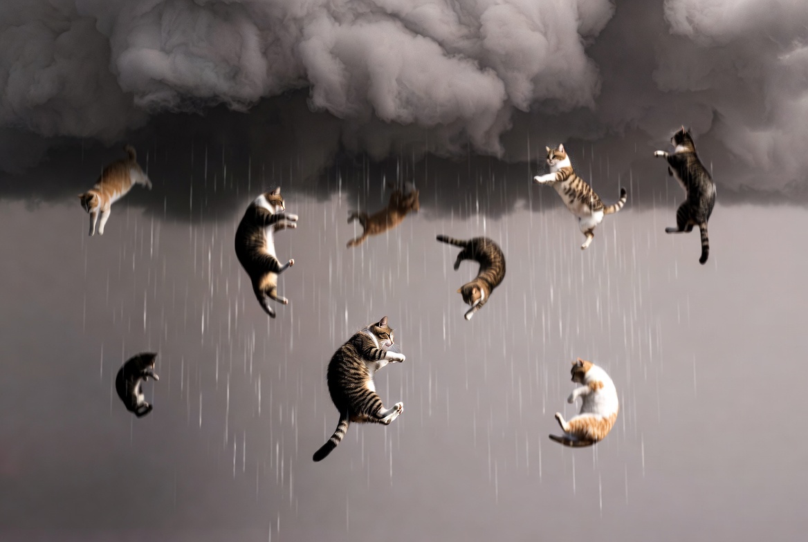 Multiple colorful cats in various tabby patterns tumble downward from dark gray storm clouds. They appear to fall like raindrops amid heavy precipitation in a dramatic sky scene. The cats are captured mid-air with dynamic poses against the cloudy background.