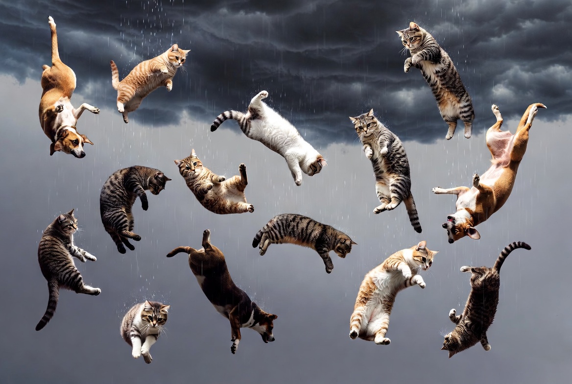 Multiple cats in various colors and patterns are falling through the air against a dark stormy cloud background. Their fur is wet from rain, and they are captured mid-fall with paws extended. The scene features an isolated dramatic sky with no other elements.