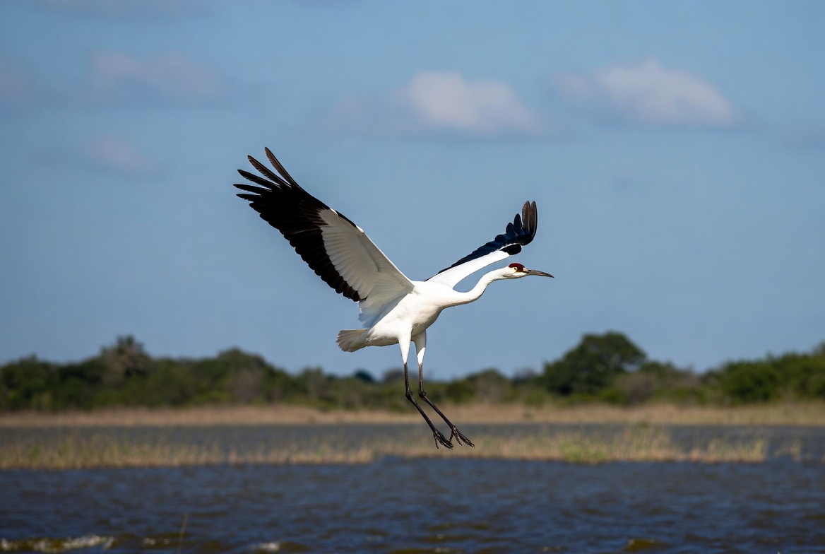 avian, bird, bird flight, black wings, blue sky, clouds, flying bird, isolated background, long legs, marsh, nature, red bill, reeds, stork, wading bird, water, wetlands, white stork, wildlife, Jabiru stork