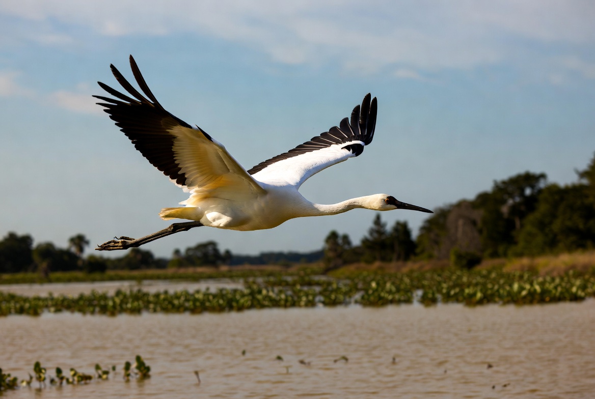 avian, background, bird, black wings, blue sky, flying, flying bird, large bird, lily pads, marsh, nature, outdoors, soaring, stork, swamp, trees, water, wetlands, white neck, wildlife, wings, yellow bird, Jabiru stork