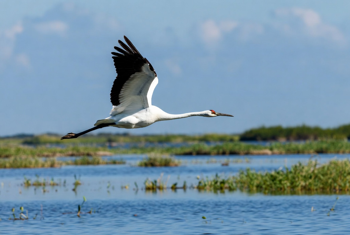 A white red-crowned crane with black wingtips and red crown flies gracefully over a marshy landscape. Its long legs trail behind and red beak points forward amid scattered green reeds and shallow blue water. Fluffy clouds dot the bright blue sky in the background.