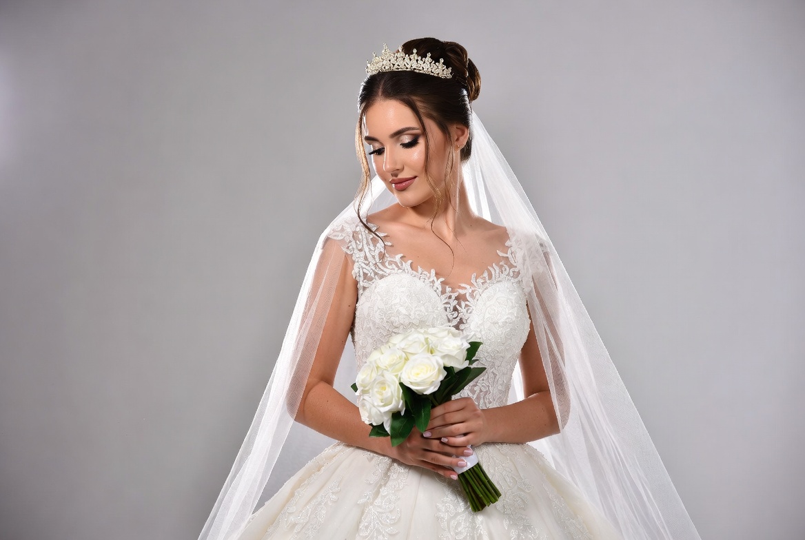 A beautiful bride with an elegant updo hairstyle and tiara stands against a gray background. She wears a white lace wedding gown with a long veil draped over her shoulders. She holds a bouquet of white roses in her hands and gazes softly to the side.