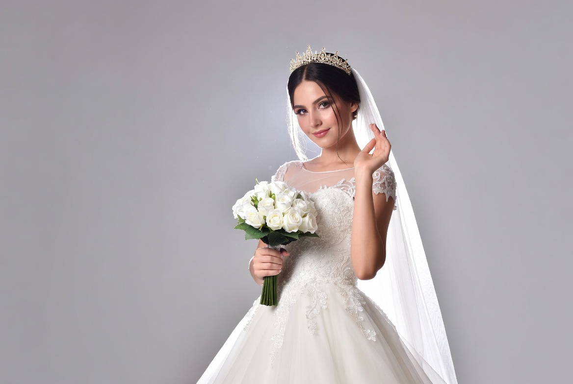 White, bouquet, bridal, ceremony, dark hair, elegant, female, flowers, gray background, hand gesture, lace dress, marriage, portrait, smiling bride, studio, tiara, veil, wedding, wedding dress, white flowers, white gown, bride