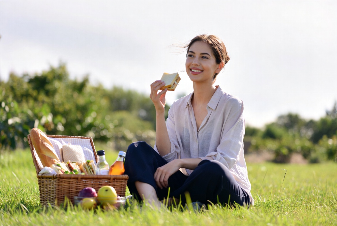 Asian, apples, beverage, blouse, bread, eating, field, food, fruits, grass, green grass, happy, juice bottle, lunch, nature, outdoor, pants, park, picnic, relaxed, sandwich, sitting, smiling, wicker basket, young woman, woman