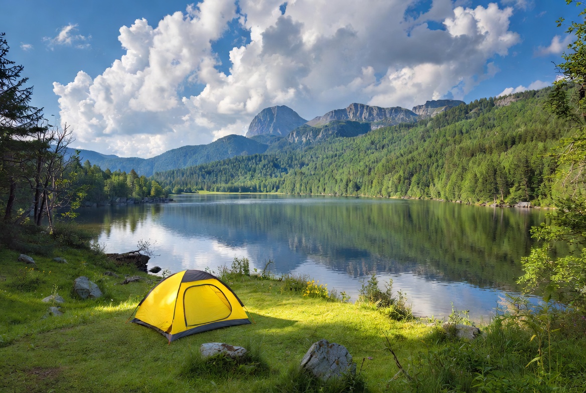 A bright yellow tent is pitched on green grass beside a calm reflective lake. Snow-capped mountains and pine forests surround the scenic landscape under a partly cloudy blue sky. The water mirrors the peaks and trees perfectly.