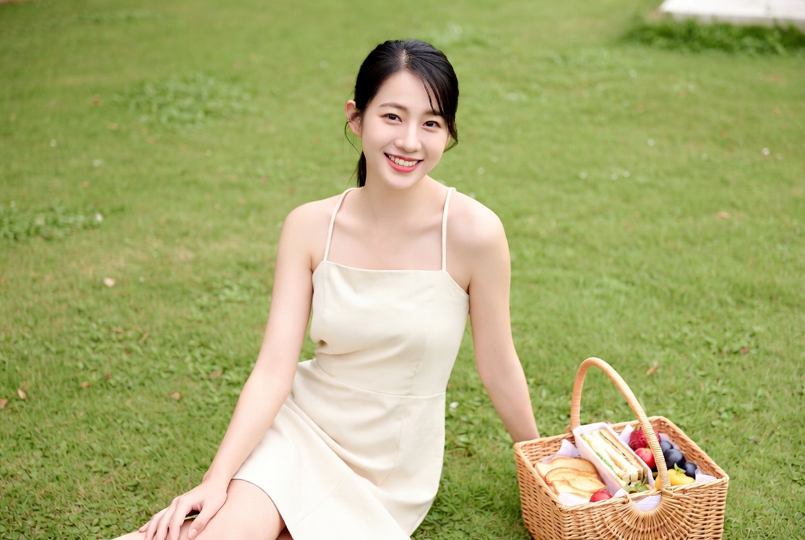 A young Asian woman with long dark hair tied in a ponytail smiles while sitting on green grass. She wears a sleeveless beige dress and holds a woven picnic basket filled with fruits, sandwiches, and snacks. The background features lush green grass and a blurred outdoor setting.