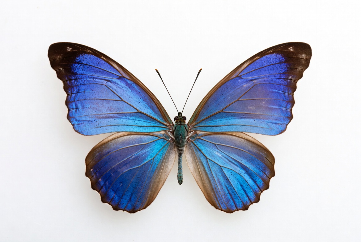 Morpho butterfly, brown edges, butterfly wings, insect, iridescent blue, isolated background, macro photography, nature, translucent veins, vibrant colors, wildlife, wings spread, blue butterfly