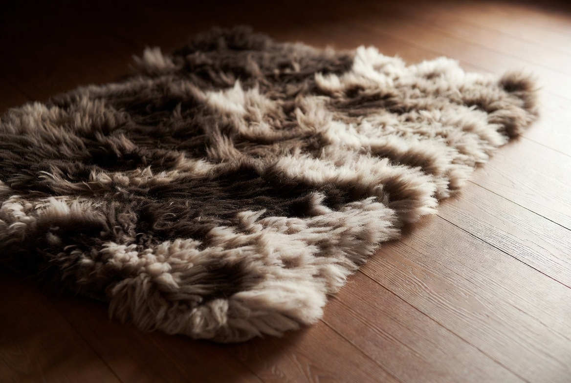 animal skin rug, area rug, brown rug, faux fur, floor rug, fluffy rug, home rug, interior decor, luxury rug, shaggy rug, soft rug, textured fur, white fur, wooden floor, sheepskin rug
