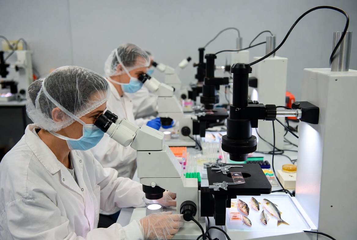 Scientists examining fish under microscopes