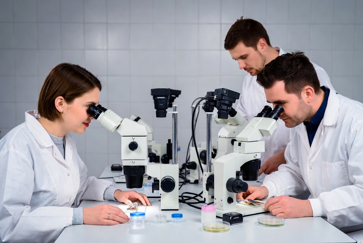White, analysis, biology, equipment, experiment, group, lab coats, lab table, laboratory, men, microscopes, petri dishes, research, science, slides, specimens, teamwork, test tubes, women, scientists
