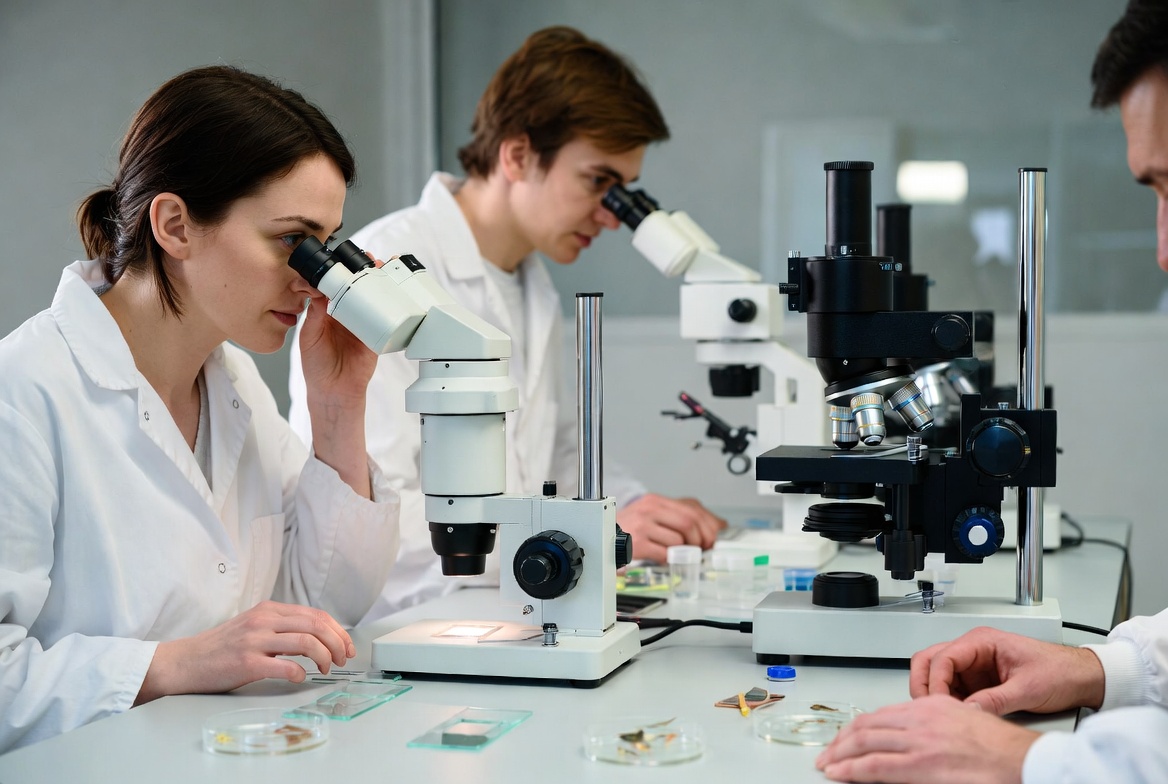 Three scientists in white lab coats collaborate at a lab bench, peering into multiple microscopes. A woman and two men focus on glass slides and samples on the table. Various microscopes and lab equipment are visible in the modern laboratory setting.
