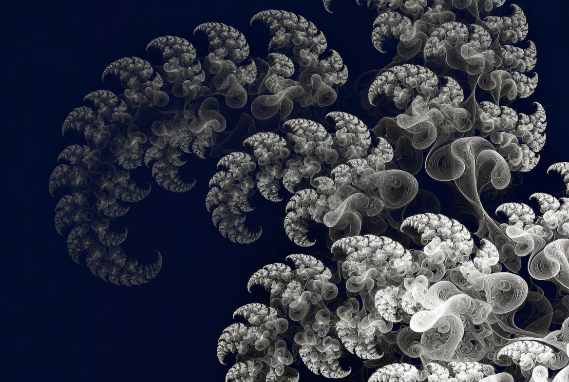 abstract, digital art, fern, fern fractal, flowing curves, fractal art, fractal pattern, generative art, intricate pattern, isolated background, mathematical art, navy background, swirling design, white fractal, fractal