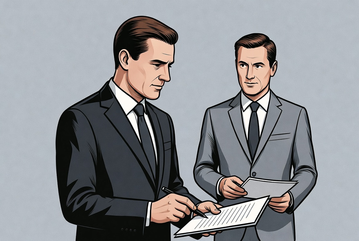 Two men in suits stand facing each other on a plain background. One holds a document while the other signs it with a pen. The illustration features sharp lines and a flat design style.