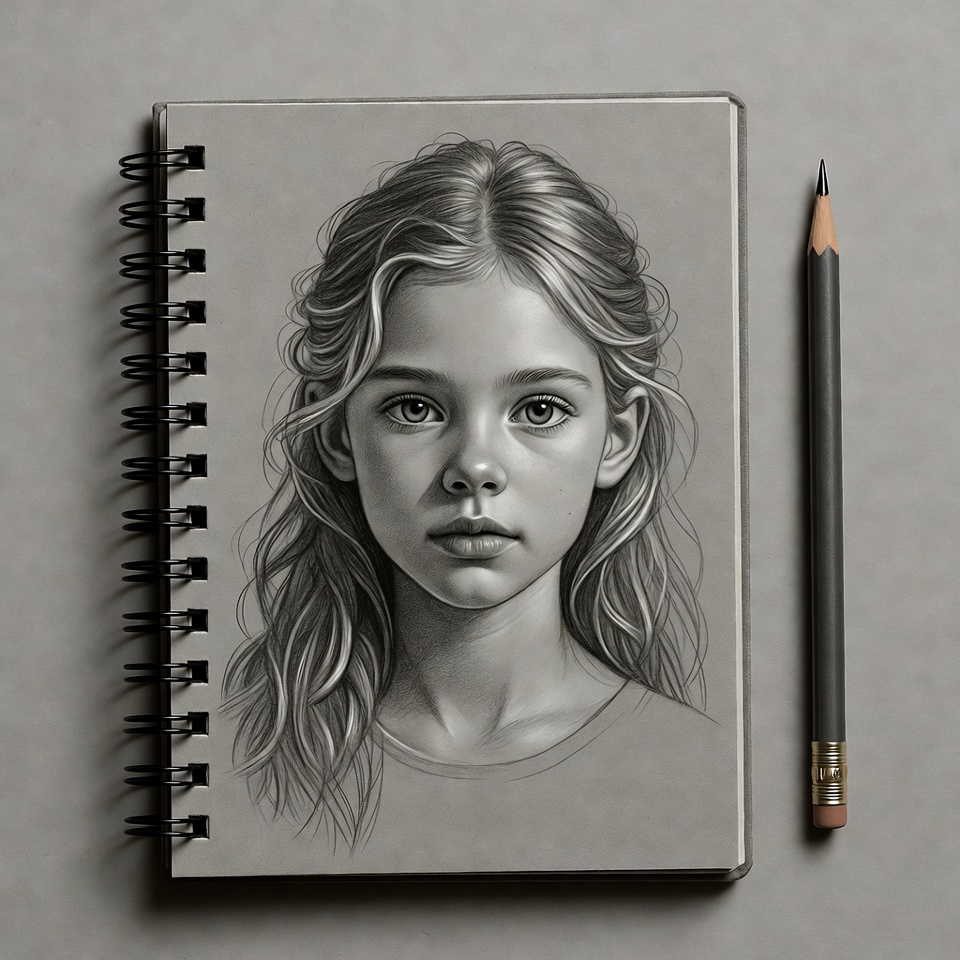 A detailed pencil drawing of a young girl with long wavy blonde hair is sketched on a page inside an open spiral-bound sketchbook. The realistic portrait shows her face with large expressive eyes and soft features. A black pencil lies beside the sketchbook on a gray surface.