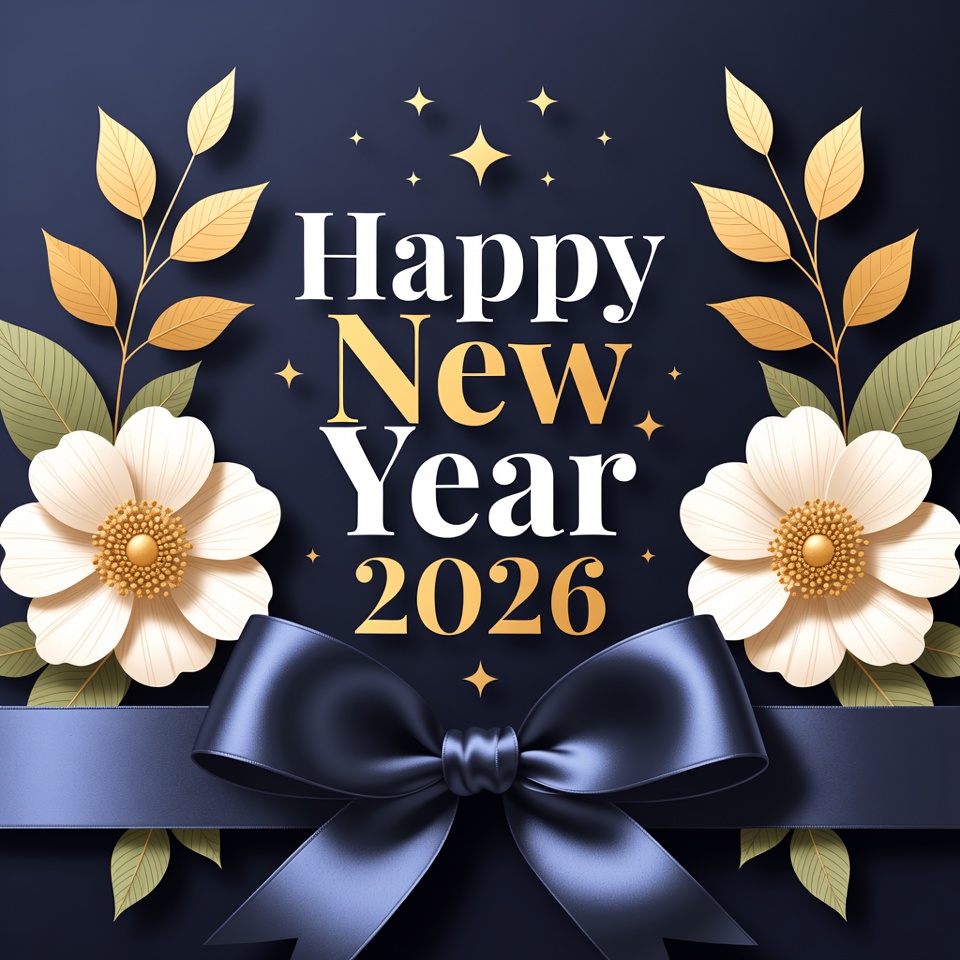 2026, blue background, celebration graphic, digital illustration, festive greeting, floral design, gold accents, gold leaves, gold text, golden stars, green leaves, holiday card, navy blue background, navy bow, new year 2026, new year card, new year illustration, papercraft style, white flowers, happy new year