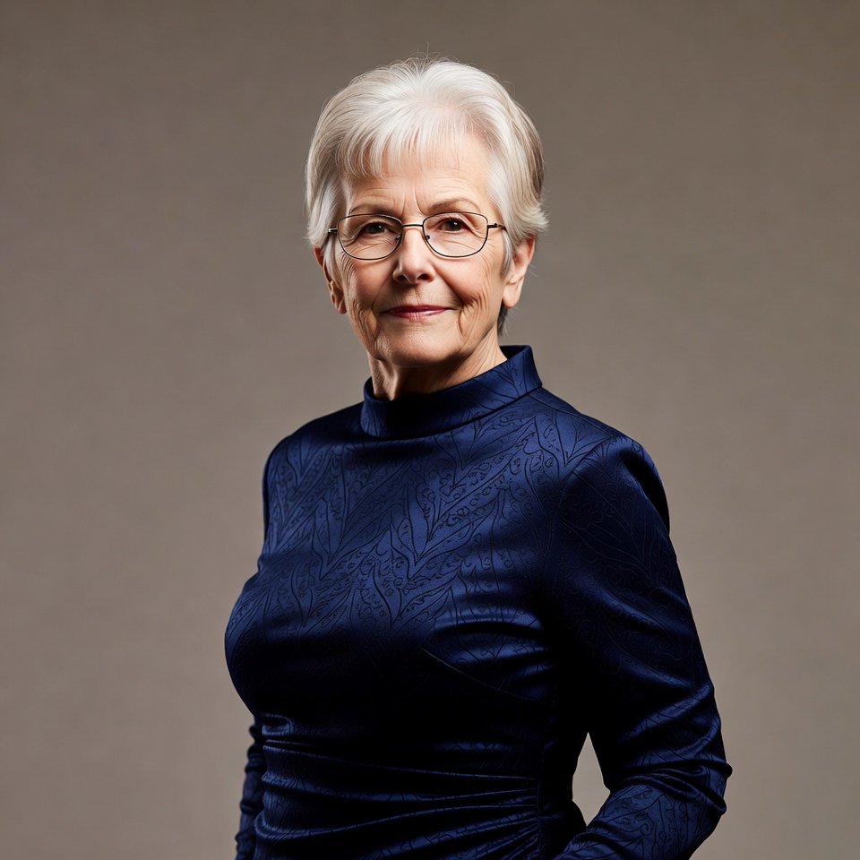 An elderly White woman with short white hair and glasses smiles at the camera. She wears a navy blue long-sleeved top with intricate patterns and stands against a plain gray background. Her expression is warm and confident.