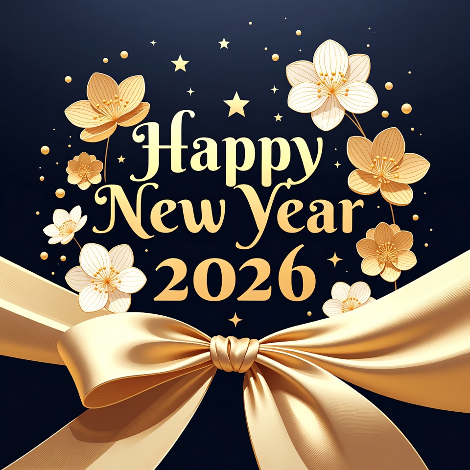 A festive digital illustration features 'Happy New Year 2026' text in elegant gold lettering on a dark navy background. White and gold flowers surround the text, accented by sparkling stars. A large golden ribbon with a bow wraps around the bottom.