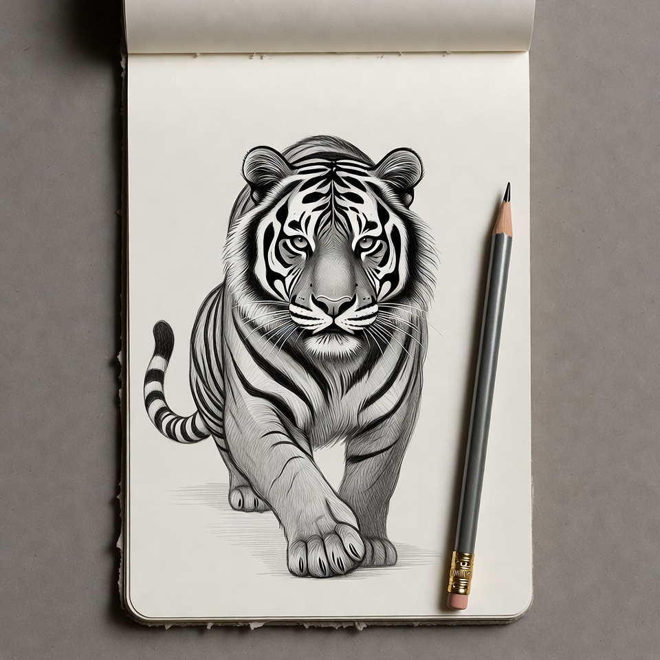 Pencil Sketch of Tiger on Sketchbook