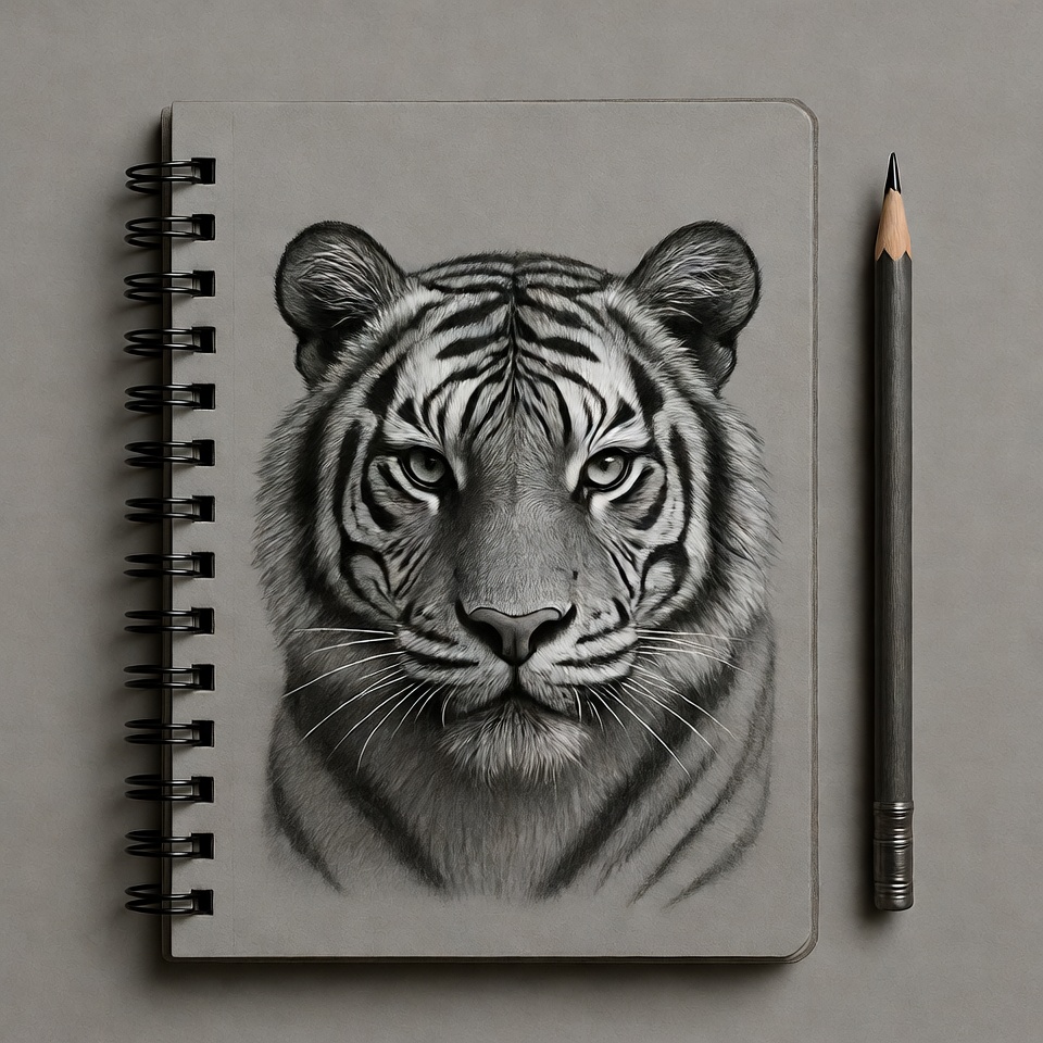 A detailed pencil sketch of a tiger's face covers the front of a spiral-bound notebook. The tiger has intense eyes, striped fur, and prominent whiskers. A single pencil rests beside the closed notebook on a plain gray background.