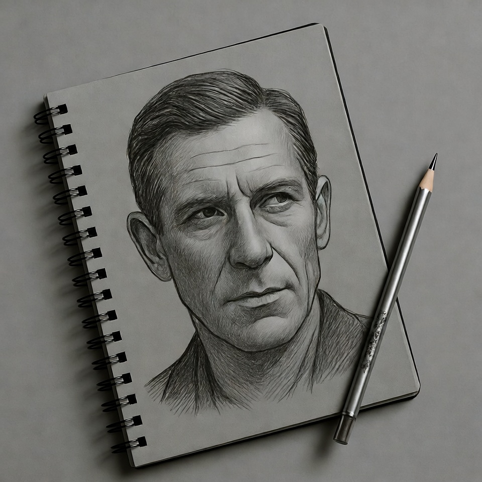 artist sketch, close-up face, drawing, fine lines, graphite pencil, illustration, intense eyes, male portrait, man, middle-aged man, open sketchbook, portrait, realistic drawing, shaded drawing, short hair, sketch art, sketchbook, spiral notebook, pencil sketch