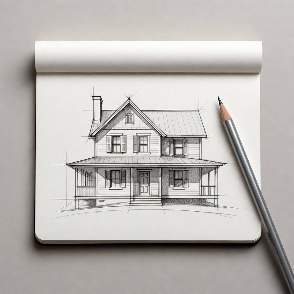 A detailed pencil sketch of a two-story house with a wraparound porch and sloped metal roof is drawn on a notepad. A pencil rests beside the open sketchpad on a light gray surface. The architectural drawing features windows, a central door, chimney, and balcony details.
