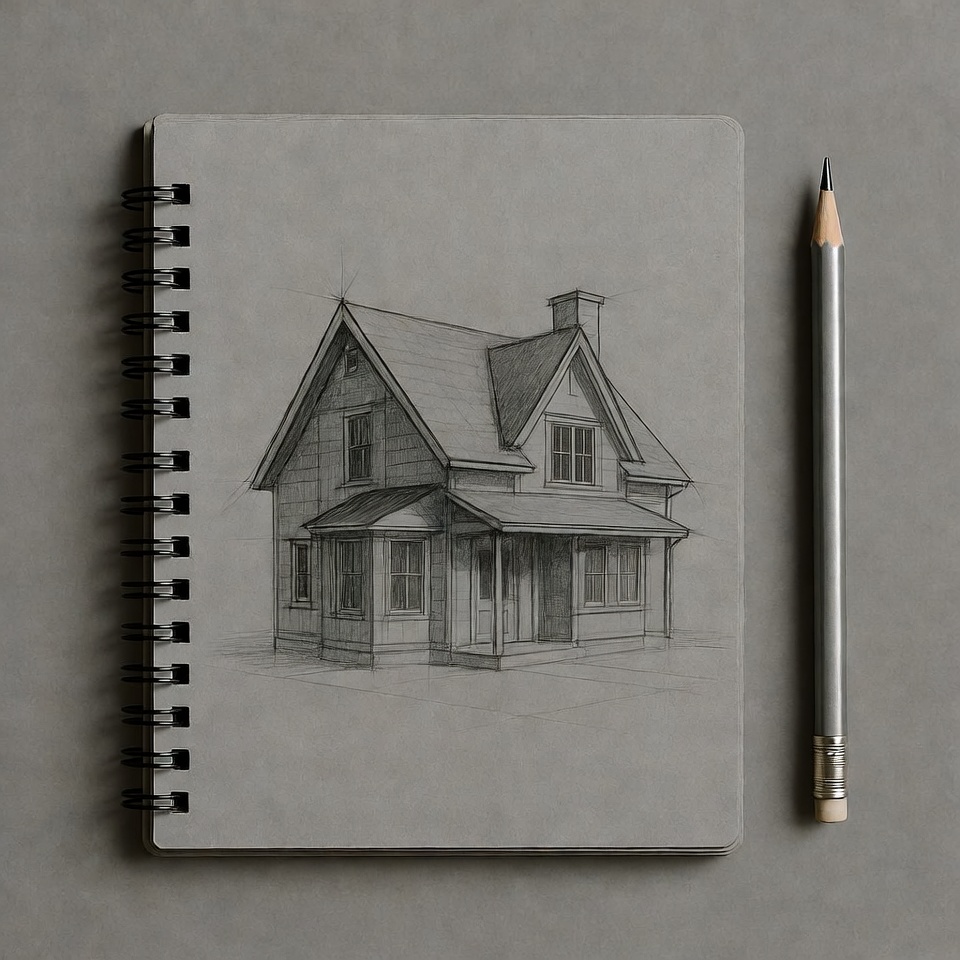 architecture sketch, chimney, drawing, gabled roof, graphite drawing, home illustration, house drawing, house sketch, illustration, isolated background, notebook, pencil, porch, sketchbook, spiral notebook, windows, pencil sketch