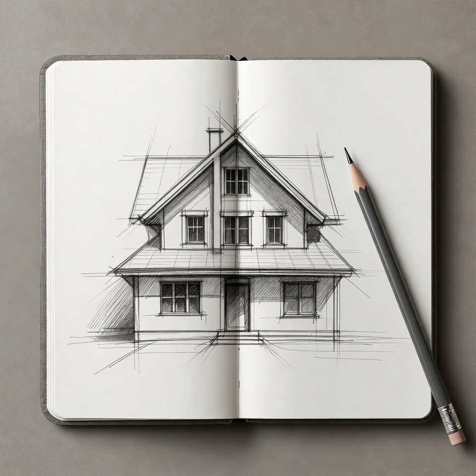 architecture sketch, building drawing, chimney, detailed sketch, front door, graphite sketch, house drawing, illustration, isolated background, open notebook, pencil drawing, residential house, shading, sketchbook, sloped roof, steps, windows, house sketch