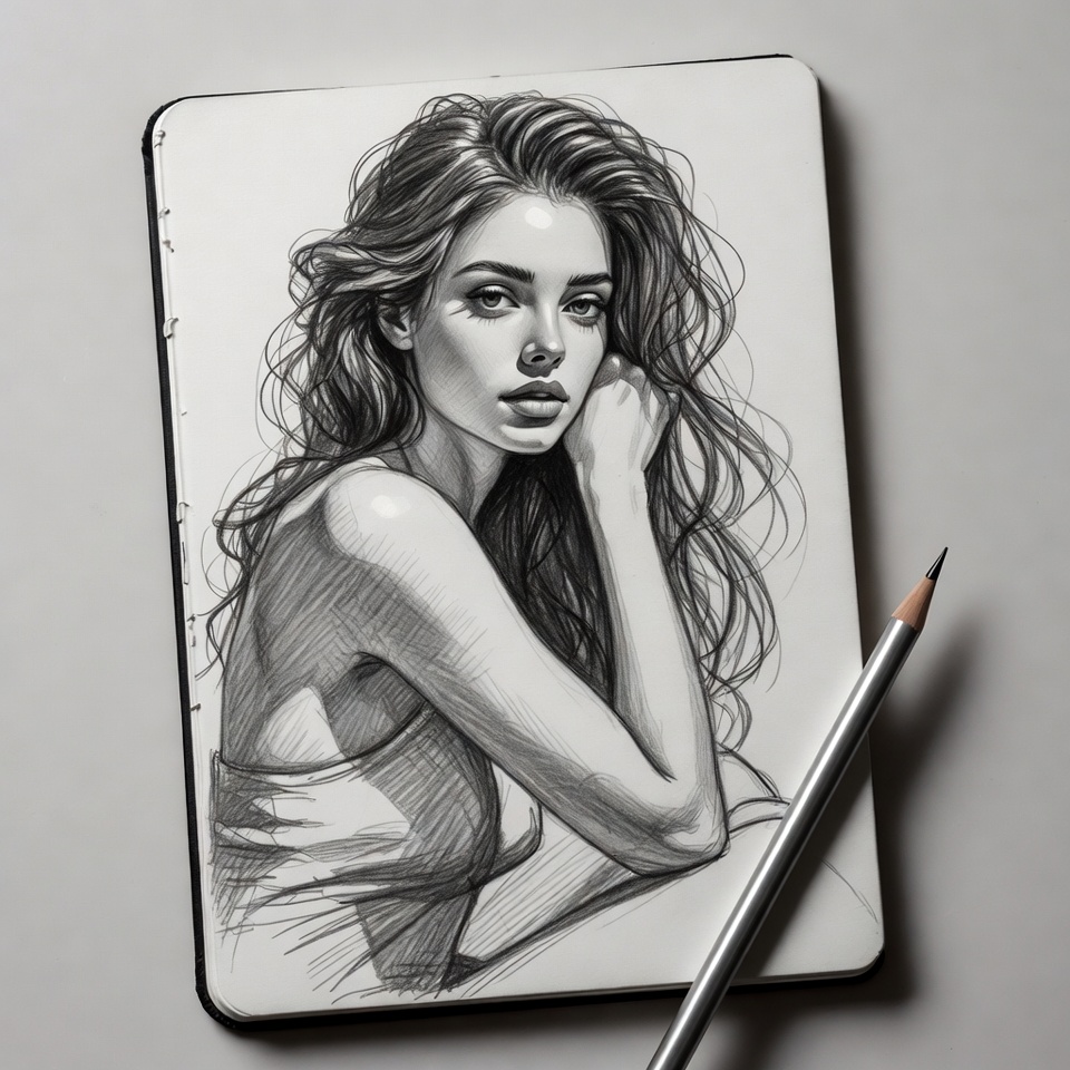 A detailed pencil drawing of a young woman with long wavy hair sits on a sketchbook page. She has a contemplative expression, touches her face with one hand, and wears a draped top exposing her shoulders. A pencil lies beside the artwork on a white background.