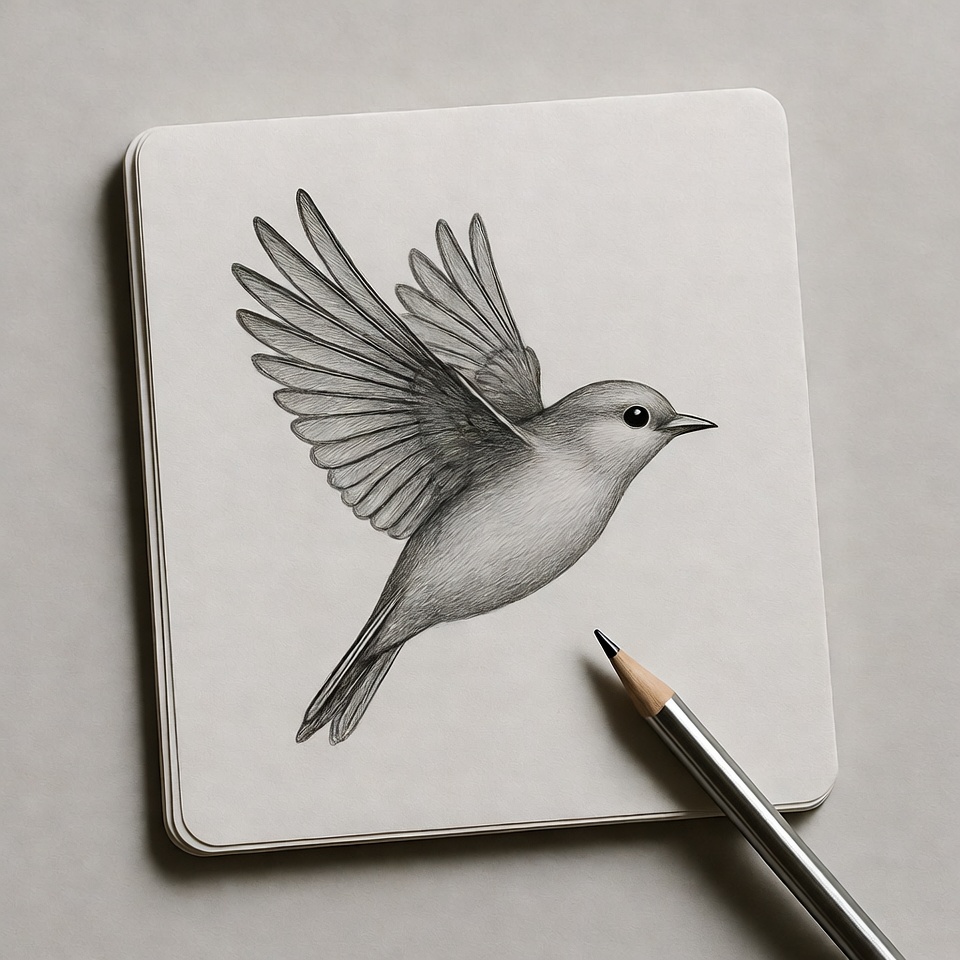A detailed pencil drawing of a small bird with spread wings in mid-flight is depicted on a white square paper. A sharp pencil lies beside the artwork on a plain background. The grayscale sketch captures fine feathers and precise shading.