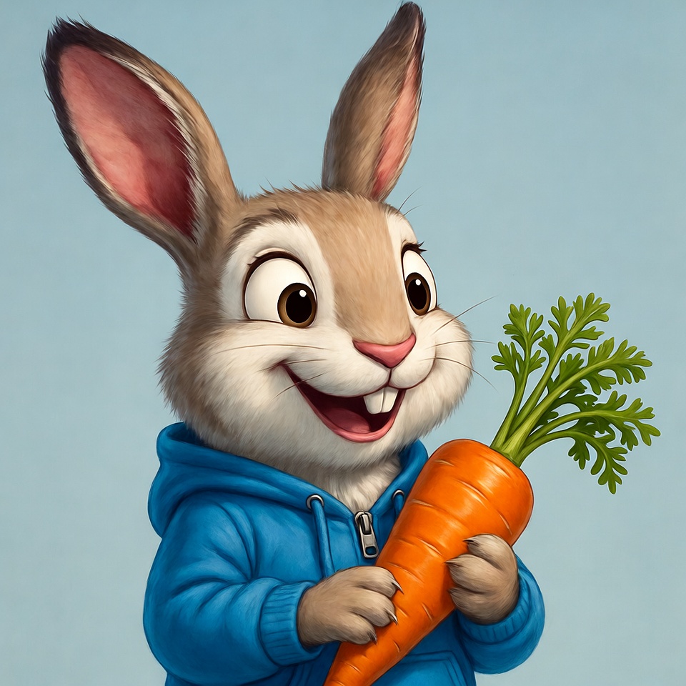 A cute cartoon bunny with big expressive eyes and a wide smile holds a fresh orange carrot with green tops. The bunny wears a blue hoodie and stands against a light blue isolated background. Its fluffy brown fur and perky ears add to the charming illustration style.