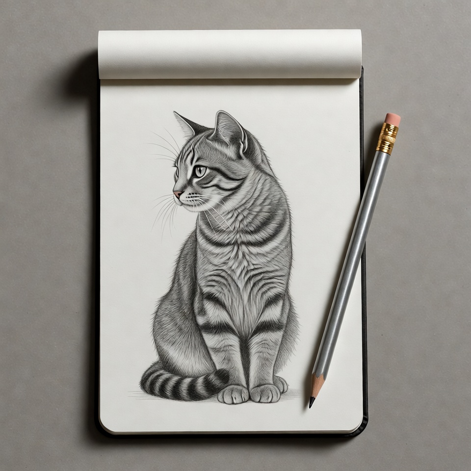 A detailed pencil sketch of a sitting tabby cat with striped fur is drawn on a white notepad. A silver pencil with pink eraser rests beside the drawing on a gray background. The cat faces sideways with attentive eyes and perked ears.