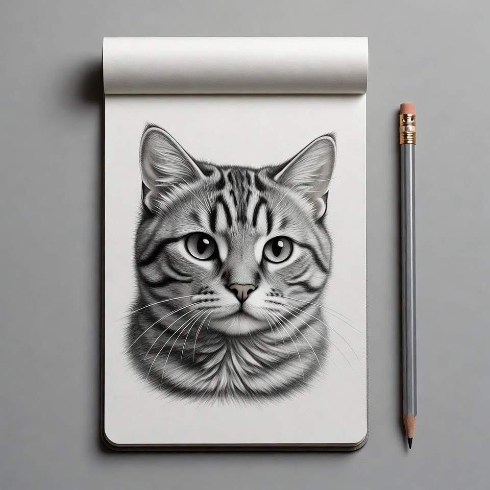 A realistic pencil sketch of a tabby cat's face is drawn on a white notepad with curled top corner. A gray pencil with orange eraser lies beside the notepad on a light gray background. The cat has detailed striped fur, green eyes, and whiskers.