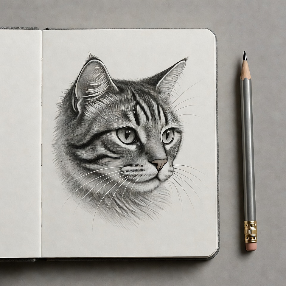 A detailed pencil drawing of a tabby cat's face is featured on an open sketchbook page. The cat has striking green eyes, striped fur, and prominent whiskers. A sharpened pencil rests beside the sketchbook on a gray surface.