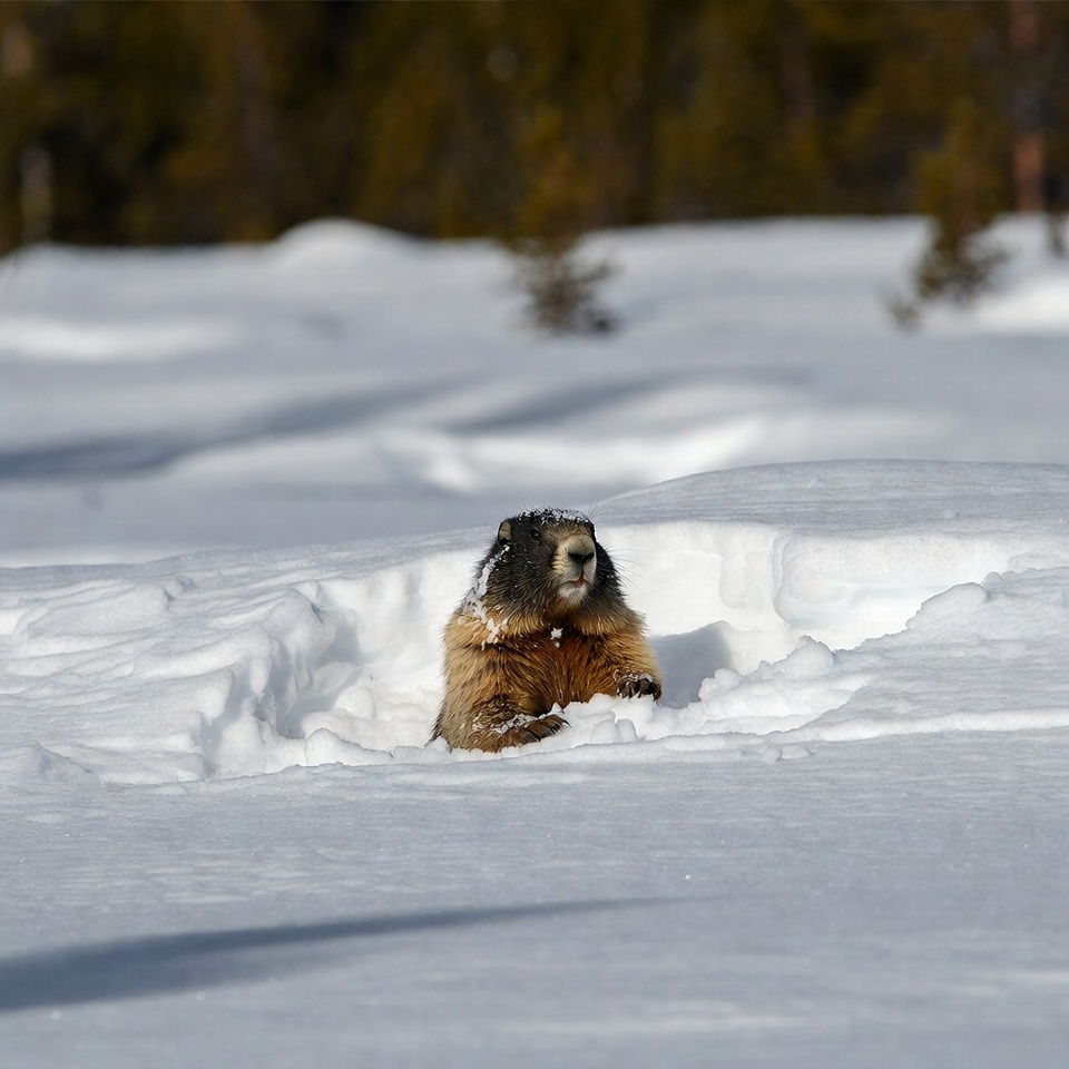 A marmot with brown fur and snow on its head peeks out from a burrow in a snowy field. Evergreen trees are visible in the blurred background under sunny winter light. The animal sits with its front paws on the snow.