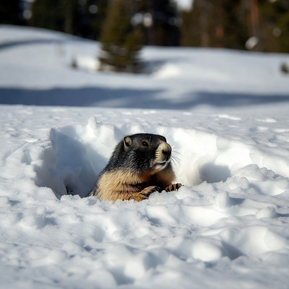 A marmot with dark head and tan body peeks out from a burrow in deep snow. It sits with front paws visible amid the white snow, surrounded by pine trees in a snowy mountain landscape. Sunlight illuminates the scene with a bright, snowy backdrop.